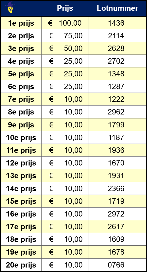 Hiernaast in de tabel vind je alle winnende lotnummers en bijbehorende prijzen.